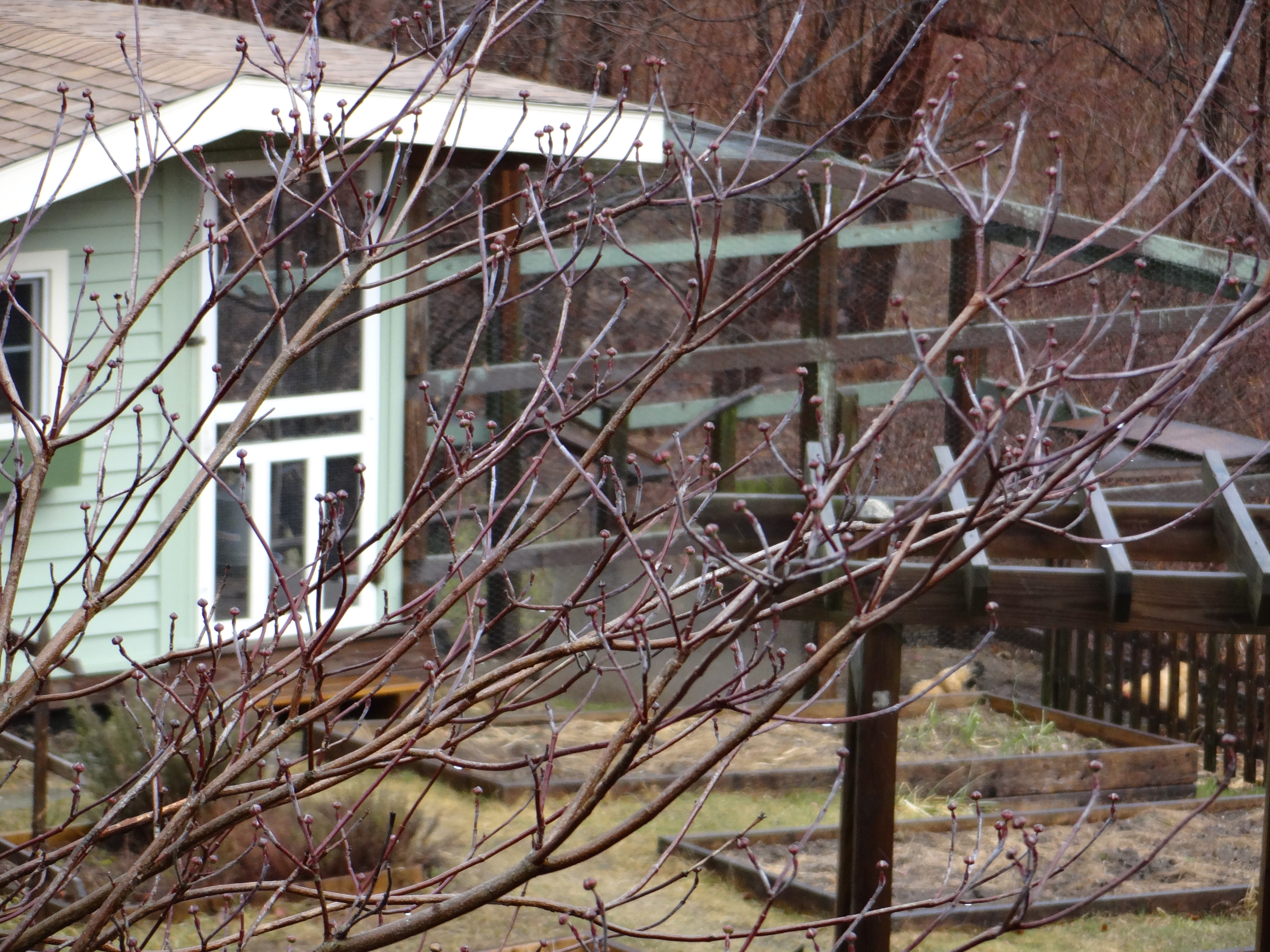 And looking up at the gray sky, there are buds on the flowering pear that we planted last spring.
